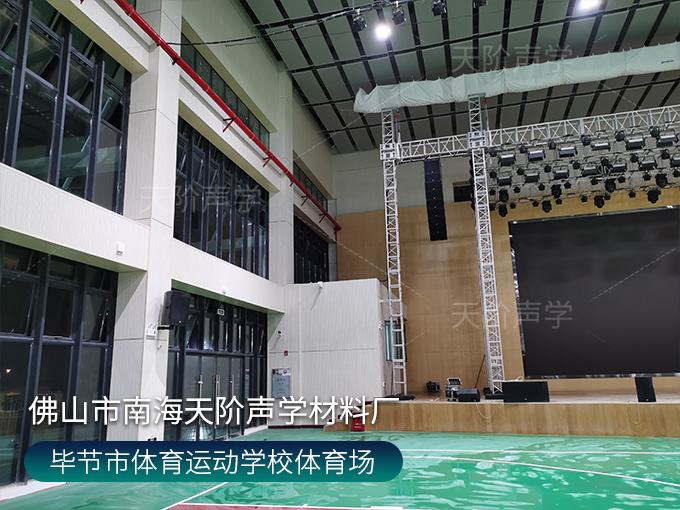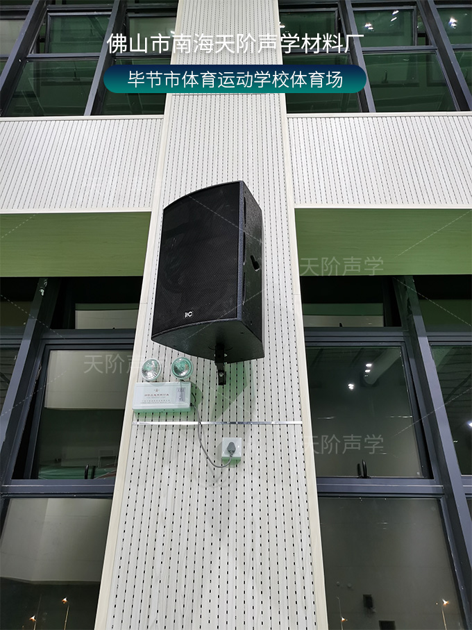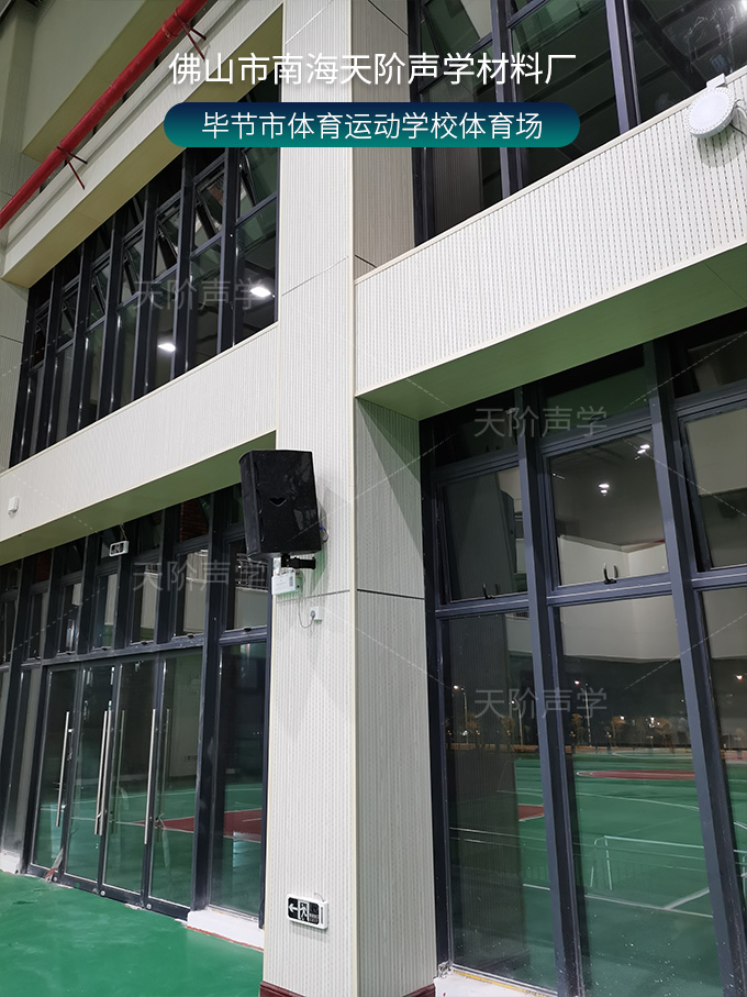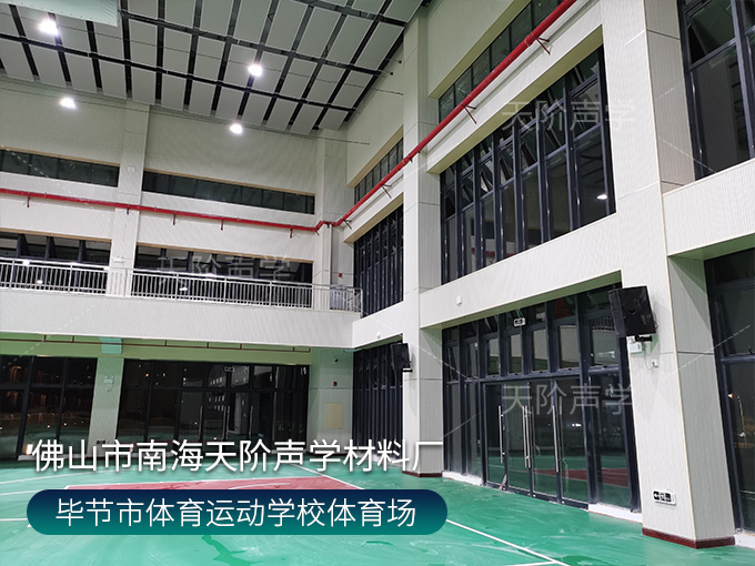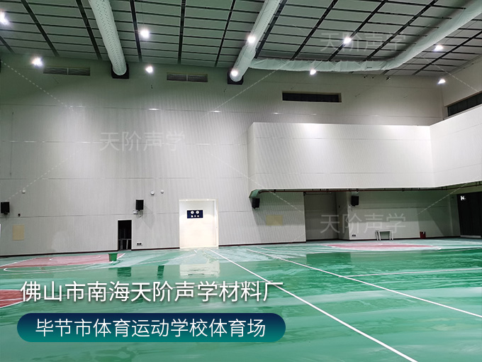 畢節(jié)市體育運(yùn)動學(xué)校體育場項目改造中,使用平板吊頂空間吸聲體用頂部吸音裝飾;墻面選用白色飾面的槽木吸音板,基材選用不燃的玻鎂基材,裝飾設(shè)計美觀,有出色的降噪效果。