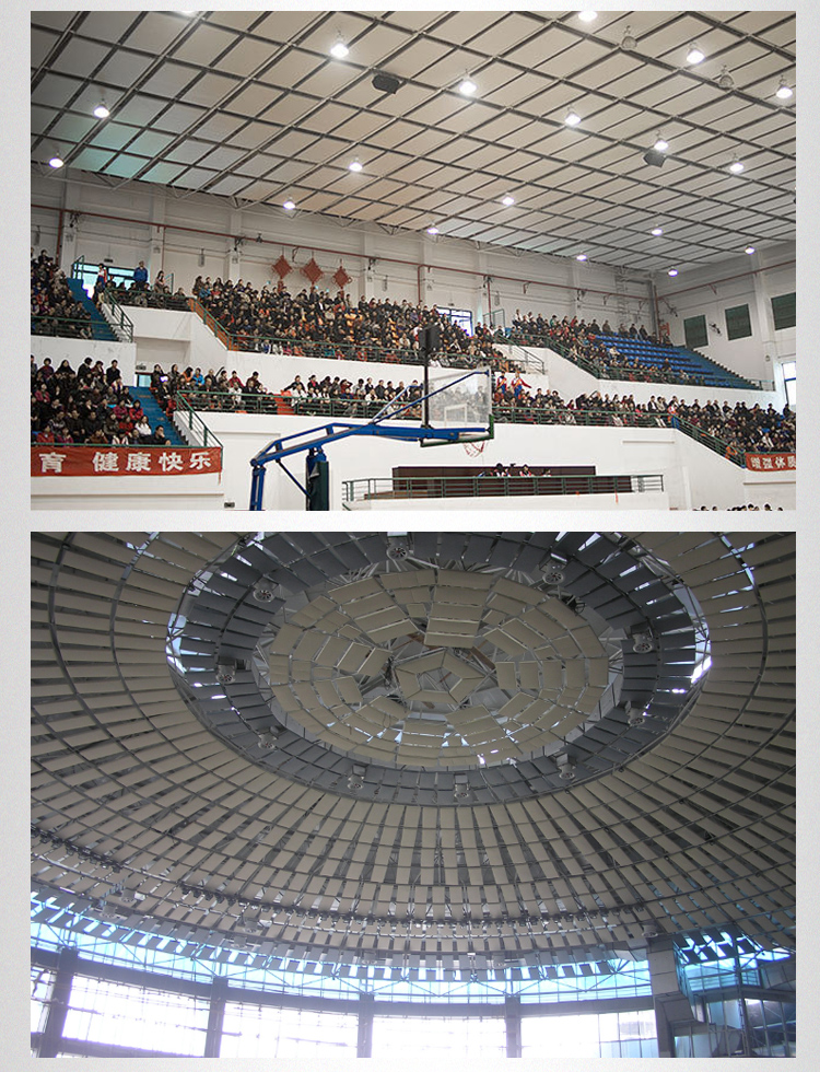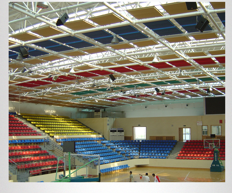 飾要求和聲源特性,可有板狀、方塊狀、柱體狀、圓錐狀和球體狀等多種形狀。其中板狀的結(jié)構(gòu)最簡(jiǎn)單,應(yīng)用最普遍??臻g吸聲體多用于室內(nèi)體育館,其各式各樣的形狀、擺設(shè)方