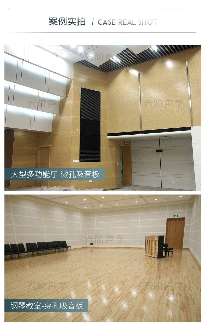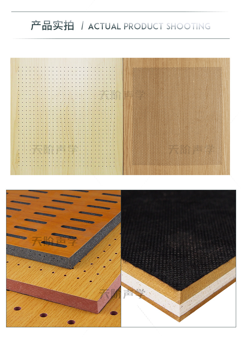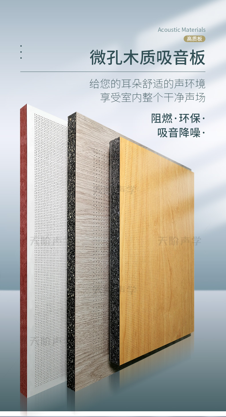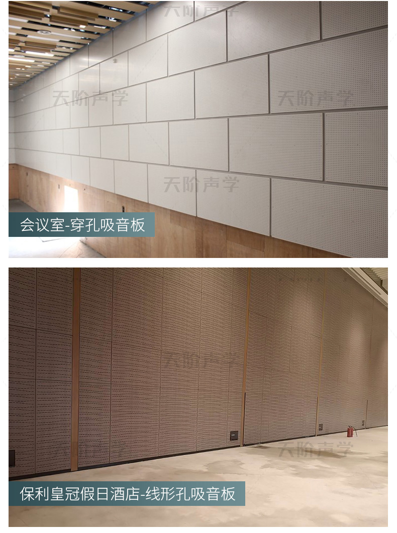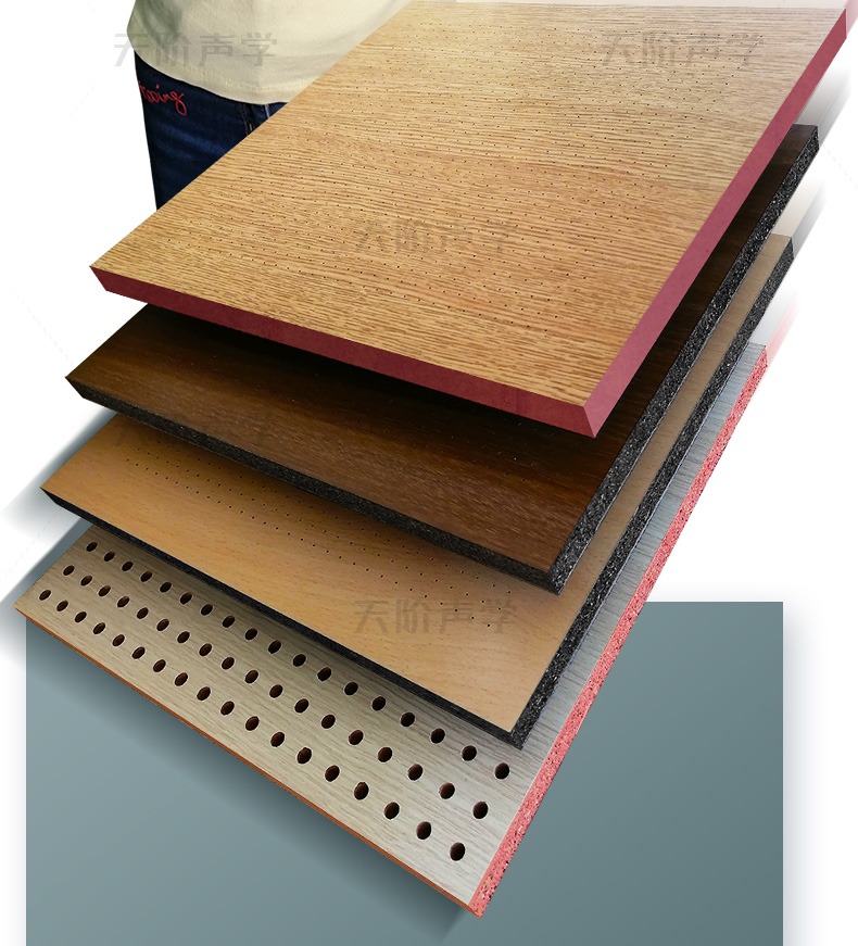 孔木吸音板是一種在密度板上直接穿孔的共振吸聲材料。孔木吸音板對吸聲頻譜選擇性較強,對低頻有很好的吸聲性能。如在吸聲結(jié)構(gòu)后空腔上填入適量的吸聲棉可提高中、高頻吸聲效果。 我們的孔木吸音板: 天階聲學(xué)孔木吸音板采用高質(zhì)的中纖板、具有環(huán)保、防火、防潮等性能,飾面顏色及材料選擇性廣,能很好地滿足客戶多樣化的聲學(xué)及裝飾需求。較槽木吸音板,孔木吸音板相對抗撞擊能力強。