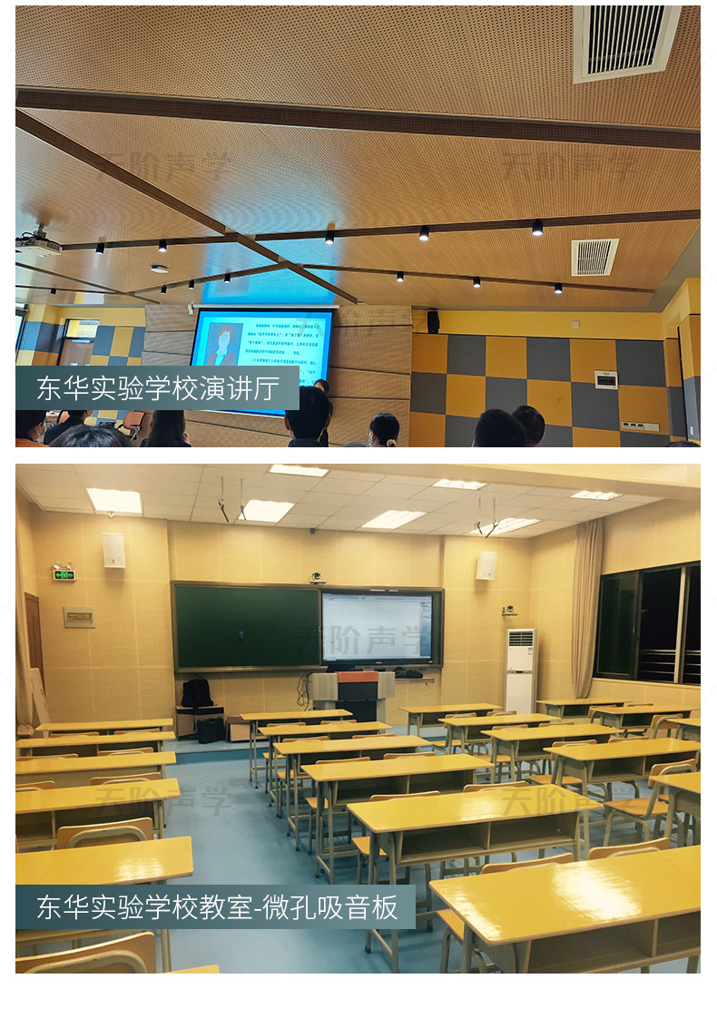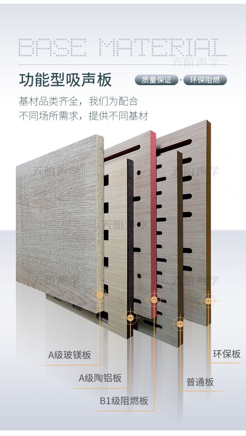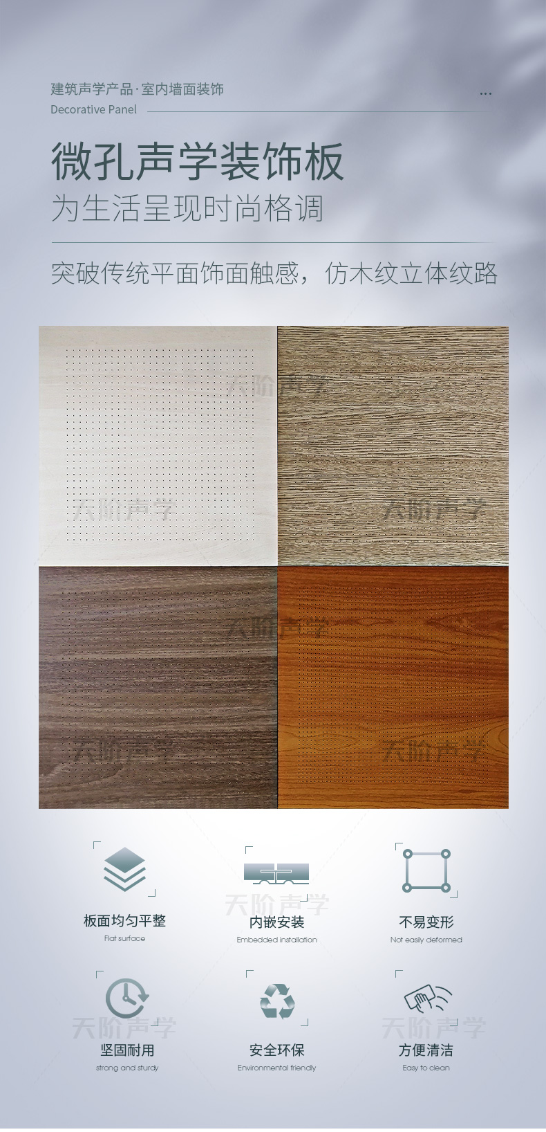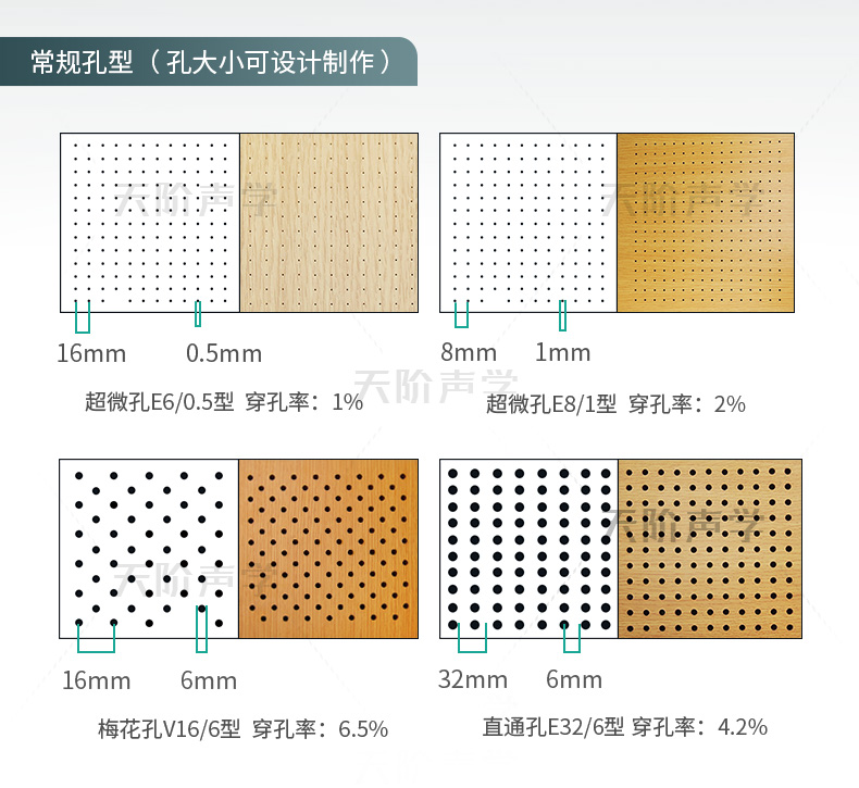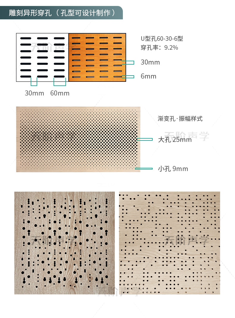孔木吸音板是一種在密度板上直接穿孔的共振吸聲材料。孔木吸音板對吸聲頻譜選擇性較強,對低頻有很好的吸聲性能。如在吸聲結(jié)構(gòu)后空腔上填入適量的吸聲棉可提高中、高頻吸聲效果。 我們的孔木吸音板: 天階聲學(xué)孔木吸音板采用高質(zhì)的中纖板、具有環(huán)保、防火、防潮等性能,飾面顏色及材料選擇性廣,能很好地滿足客戶多樣化的聲學(xué)及裝飾需求。較槽木吸音板,孔木吸音板相對抗撞擊能力強。