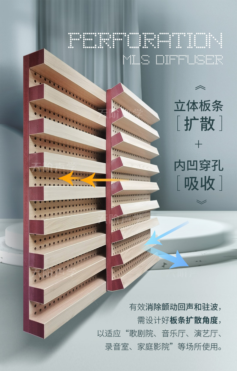 擴(kuò)散是指聲音朝著許多方向不規(guī)則反射、折射和衍射的現(xiàn)象。擴(kuò)散對(duì)“豐滿度”、“活躍度”、“空間感”是有利的,并且能保持豐滿和明晰度之間的平衡,語(yǔ)言清晰度和較長(zhǎng)混響時(shí)間之間的平衡,還可以保持觀眾廳內(nèi)音調(diào)的自然性??梢宰屖覂?nèi)聲能分布均勻,清除回聲等。室內(nèi)擴(kuò)散不好,音色往往很粗糙。擴(kuò)散體就是為改進(jìn)聲場(chǎng)擴(kuò)散性能所采用的布置,設(shè)計(jì)依據(jù)是利用不規(guī)則界面改變發(fā)射聲的波前,或者改變聲阻抗。
