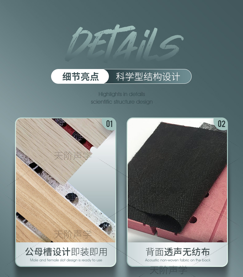 本公司專業(yè)生產(chǎn)木質(zhì)吸音板,布藝吸聲板、吸音軟包、木絲吸音板、聚酯纖維吸聲板、隔音板、空間吸聲體、擴(kuò)散體、隔音材料與聲學(xué)活動(dòng)隔斷等多種聲學(xué)品類